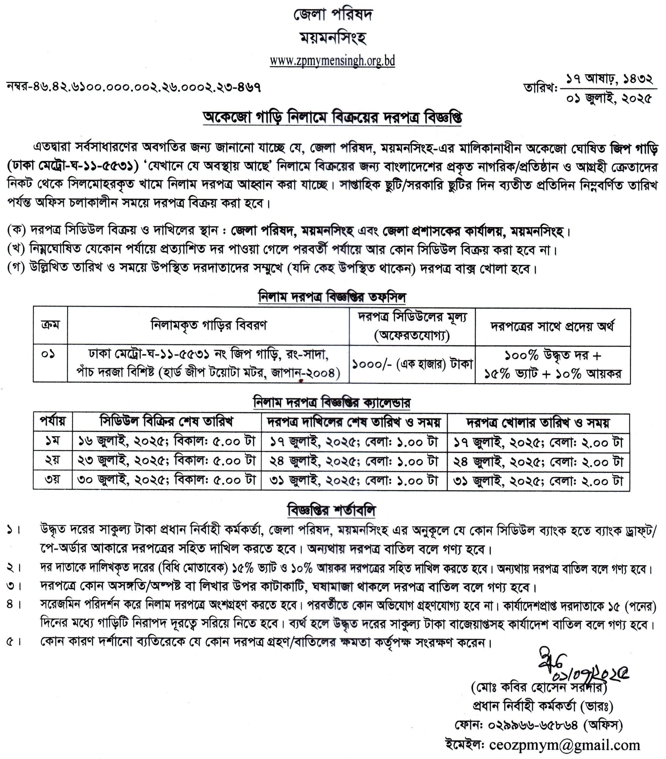 ময়মনসিংহ জেলা পরিষদের অকেজো গাড়ি নিলামে বিক্রয়ের দরপত্র বিজ্ঞপ্তি Download Click Here